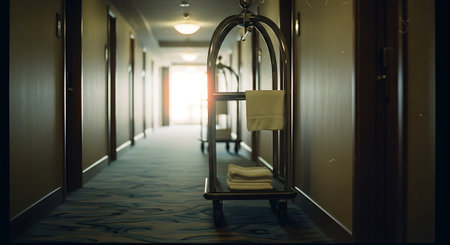 Interior of a hotel corridor with long corridor and lighted lamps