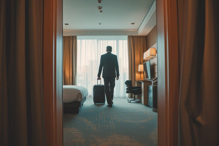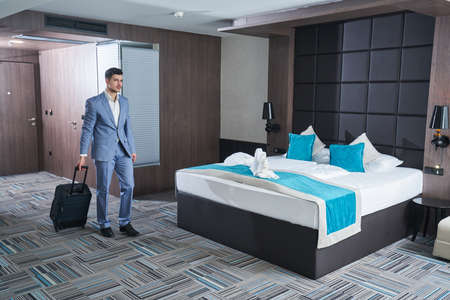 Businessman with suitcase in hotel room, back view. travel concept