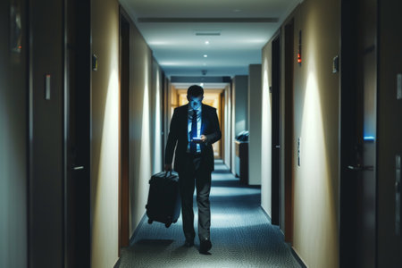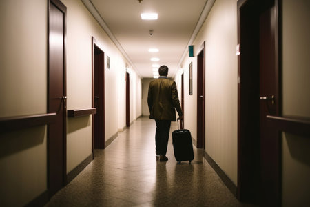 Man suitcase luggage in hotel. Travel person. Generate AI