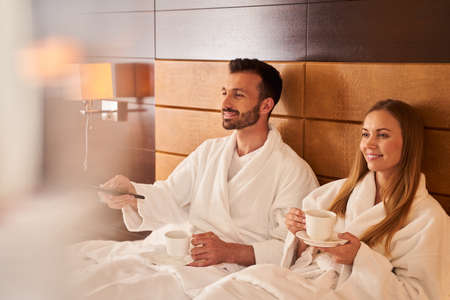 Joyful couple watching tv with hot drinks in bed