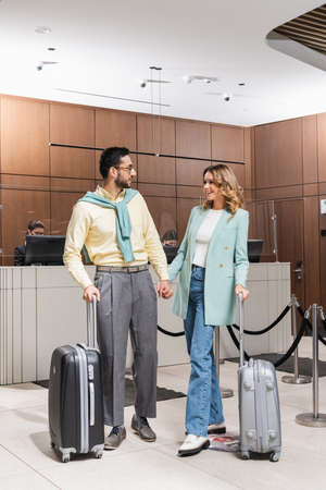 Smiling woman with suitcase looking at Arabian boyfriend during vacation in hotel