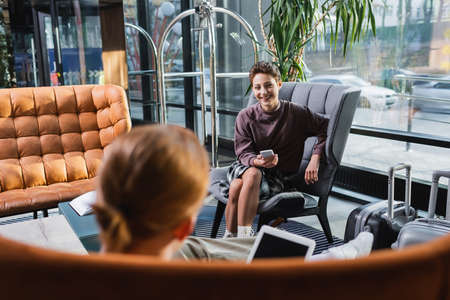 Smiling woman holding smartphone near blurred boyfriend and suitcases in hotel lobby