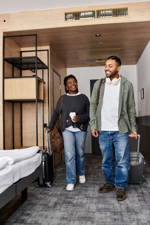 A young couple enjoys each others company in a cozy hotel room, embracing their love on vacation.