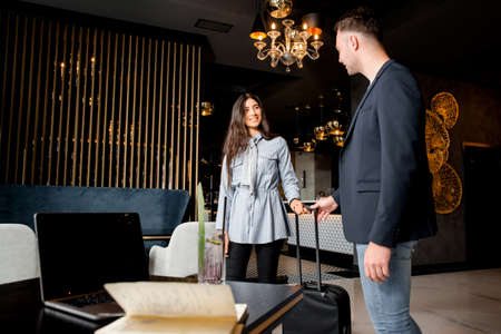 Young smiling manager of modern hotel consulting female traveler with suitcase entering lounge and moving towards reception counter