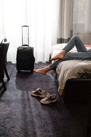 woman taking off footwear in a hotel room on the bed. Tourist relaxing on hotel room after travelling with suitcase. Female having rest after long trip with language Dark silhouette