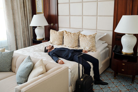 Young tired businessman in formalwear relaxing on comfortable double bed in room of luxurious five star hotel during business travel