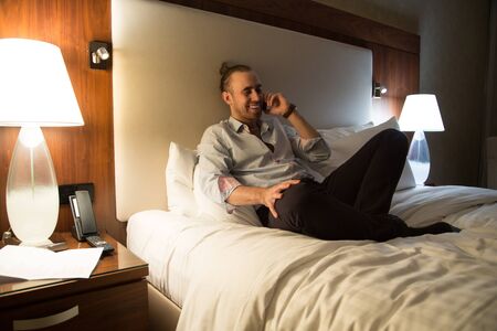 Handsome young stylish caucasian man calling by phone on the bed in the bedroom