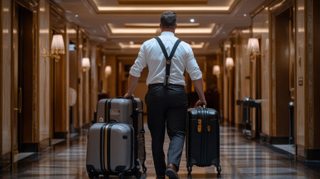 A man is walking down a hallway with two suitcases. He is wearing a white shirt and black suspenders