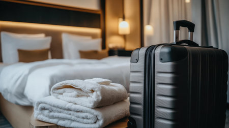 A sleek piece of luggage stands beside a neatly arranged bed, with fluffy towels adding to the inviting hotel ambiance, ideal for showcasing travel and hospitality themes.