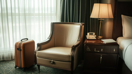 A warm and inviting hotel room corner showcasing a classic armchair, stylish lamp, neat bedside table, and a suitcase for travelers looking for comfort and relaxation.