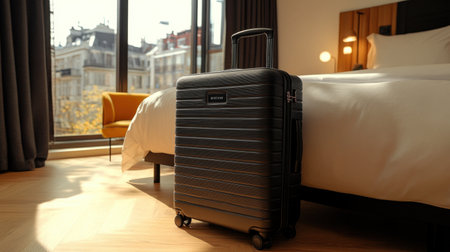 A sleek black suitcase stands beside a cozy bed in a modern hotel room, showcasing stylish decor and inviting ambiance perfect for travel.
