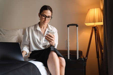 Mid aged brunette white businesswoman sitting on bed in a hotel room typing on mobile phone working on laptop