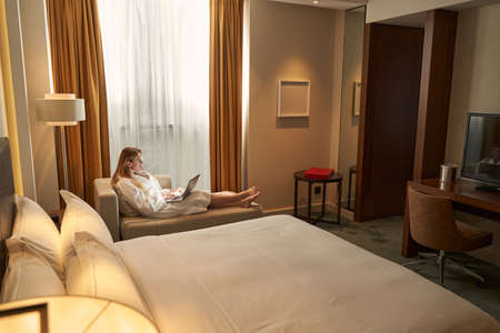 Pleasant mature woman staying at hotel during business trip