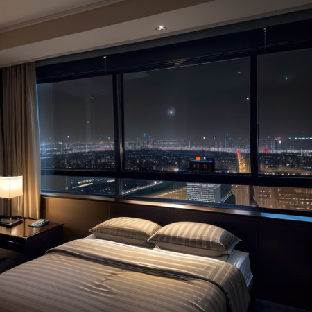 Hotel bedroom at dark gloomy with city sky A room with a view of the Side