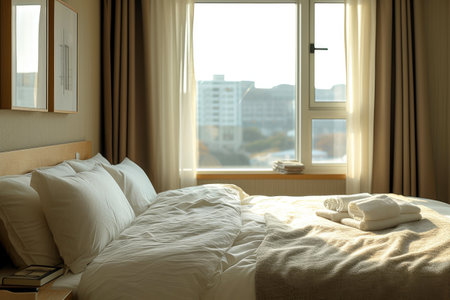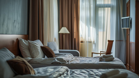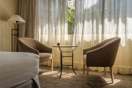 Interior of a hotel bedroom with sunlight passing through the window.