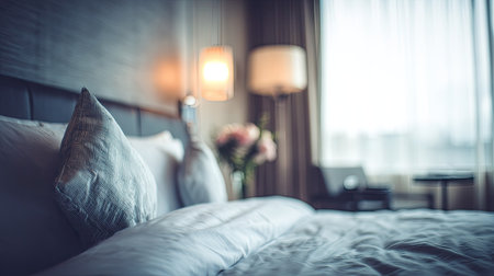 Unclear hotel room interior with luxurious decor and a cozy atmosphere.
