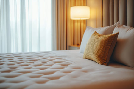 A high-quality, professional photograph of an elegant mattress centered in the frame, with a white sheet and pillows with golden accents, standing against the wall near a floor lamp. The background features light curtains, creating a bright atmosphere. A luxurious bed frame adds to its appearance. High resolution, shot using a Canon EOS R5 camera. --ar 3:2 --v 6.1 Job ID: 9515210e-670a-4ac6-abfa-d6f0af55a4b8