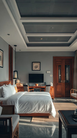 This interior photograph features a well-lit bedroom with a large bed, desk, and various decorative elements. The room showcases a blend of wood and neutral tones, with natural light streaming in. This image may be suitable for illustrating concepts related to hospitality, interior design, and lifestyle. Potential uses include editorial and commercial projects.