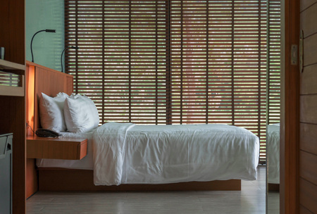 Bedroom comfortable interior design in the morning, Compact hotel room with facility accomodation