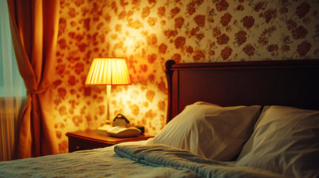 A cozy bedroom scene featuring a softly lit lamp and floral wallpaper, creating a warm atmosphere ideal for relaxation and restful sleep. Perfect for home decor inspiration.