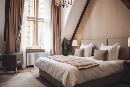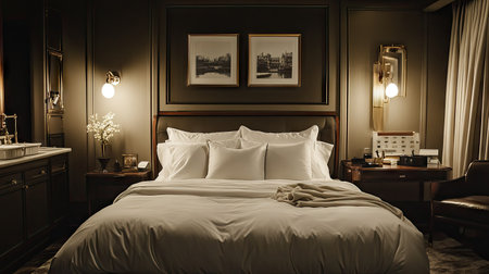 Hotel bedroom with a large bed, luxurious bedding, and soft lighting, evoking a sense of warmth and comfort