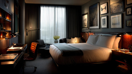 Elegant hotel room with cozy ambiance and modern decor.