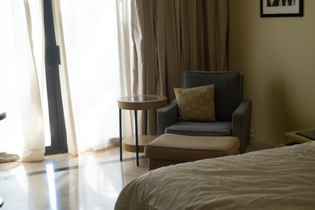 Elegant hotel room interiors with modern furniture and copyspace. Interior design composition soft tones.
