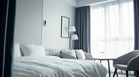 Experience Ultimate Comfort in an Elegant Hotel Bedroom with Large Windows and Luxurious Amenities
