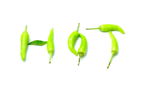 View Of Red Chili Peppers Arranged As Hot Text Over White Background.