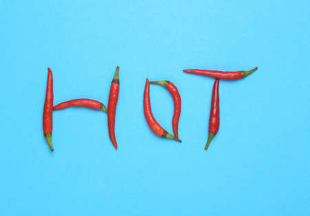 Word hot made from red chili peppers on a blue background