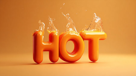 Orange Hot 3d text with splashes of water on orange background