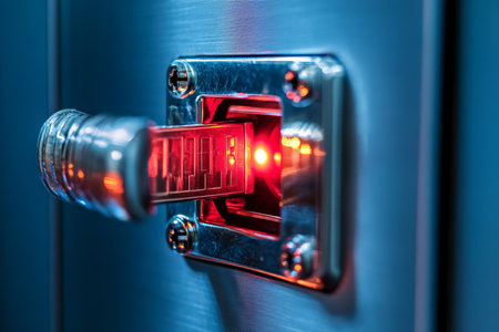 A close-up view of a hand inserting a connector into a device illuminated by a red light, capturing the intricate details of modern technology and electronics.