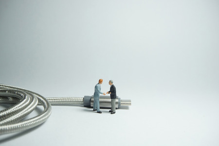 Businessman figure standing in front of usb USB type C cable. E commerce concept.