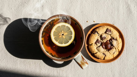 A steaming cup of herbal tea offers a moment of quiet comfort on a cool day.