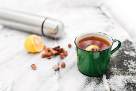tea with lemon and cardamom in a green mug against the background of a snow-covered table, wood nuts flask in the background