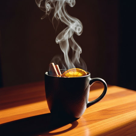 A warm cup of herbal tea with lemon and spices, set on a rustic wooden table in a cozy kitchen.