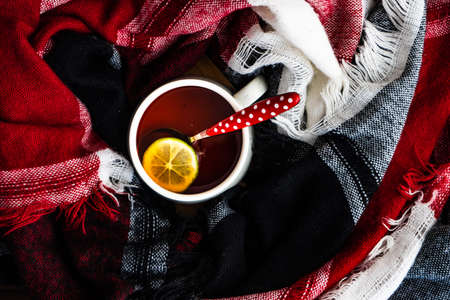 Hot tea with lemon and scarf. Winter time. Selective focus
