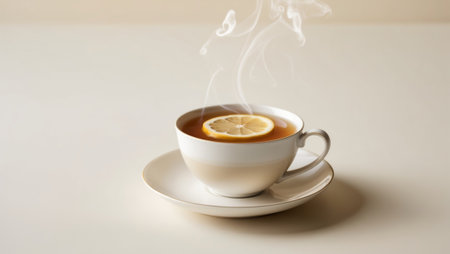 AI Generated. A steaming cup of tea with a lemon slice on a saucer