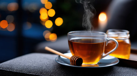 A steaming cup of tea sits on a gray table with a honey jar nearby. Soft candlelight flickers, creating a warm, inviting atmosphere perfect for relaxation in the evening.
