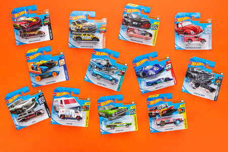 Ukraine, Kyiv - February 28.2020: The group of colorful toy car collection on orange background. Hot Wheels. Top view.