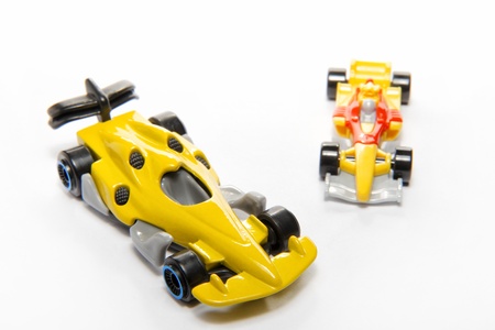 Two inverted mini toy car crash on yellow background, incident, car traffic accident