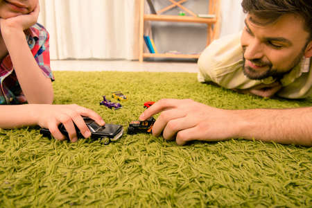 child toys left on the rug in living room. black car model ir car crash on the floor