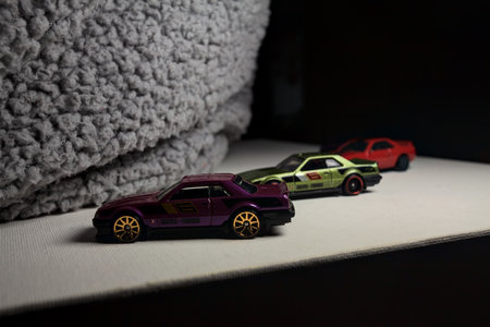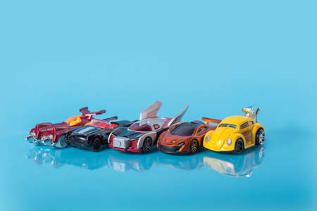 Top view random collection of model sport car toy hot wheels on wooden floor