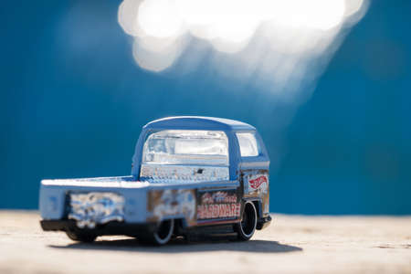 POZNAN, POLAND - Mar 11, 2020: Blue Mattel Hot Wheels Zotic toy futuristic police race car in soft focus background.