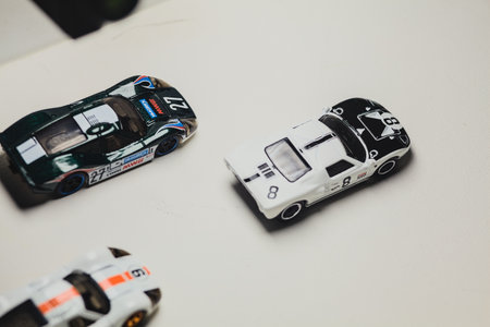 Mantua, Italy - 28TH DECEMBER 2025 - Hot Wheels replicas of two Ford GT40 Mark IV, one in a green race livery, another in white and orange Gulf race livery, and a GT40 in black and white race livery pretending to have a race on a race track