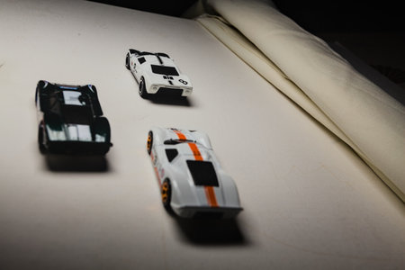 Mantua, Italy - 4TH JANUARY 2025 - Hot Wheels replicas of two Mazda 787B in race livery on white board, bordered by white rolls of fabric, pretending to make a curve on a road and having a race between them