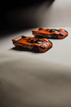 Mantua, Italy - 28TH DECEMBER 2025 - Hot Wheels replicas of two Porsche 917C in orange race livery pretending to have a race on a race track
