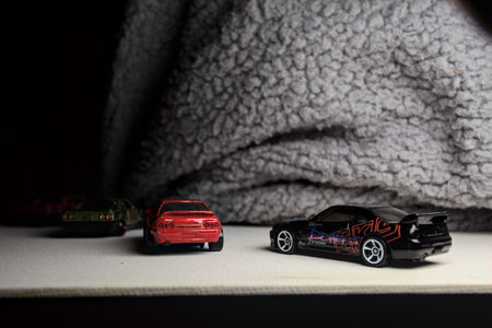 Mantua, Italy - 3RD JANUARY 2025 - Hot Wheels replicas of various Nissan Skyline models, two R30, a GT-R R32 and a GT-R R33, on a white board, next to a gray piece of fabric, pretending to have a race on a mountain road by the edge of a cliff