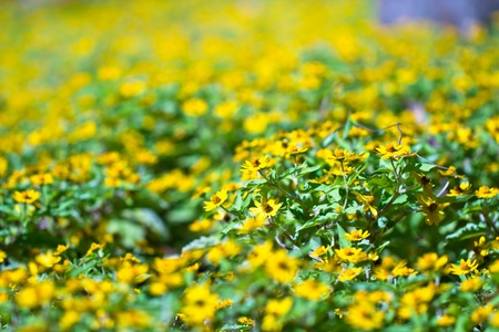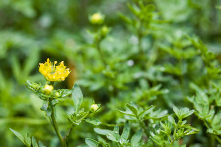 Small yellow wild flowers grow in summer garden with beautifull soft bokeh