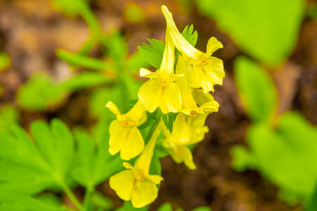 Blooming Golden Saxifrage Chrysosplenium alternifolium with soft edges. selective focus. Has healing properties. Yellow spring small flowers.